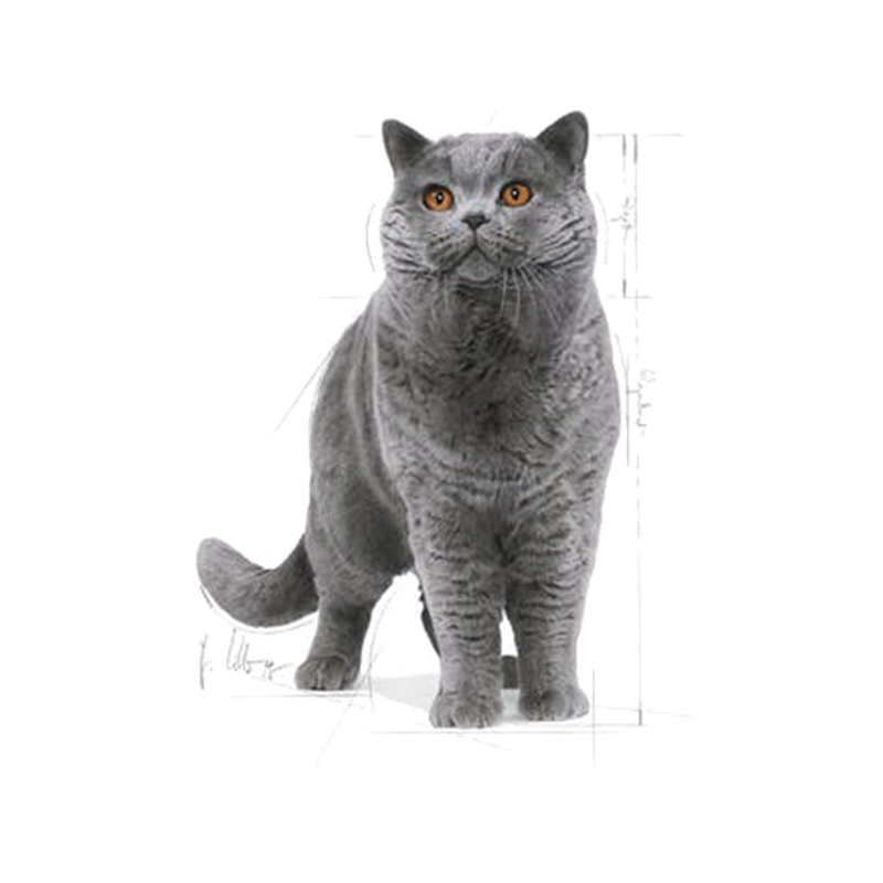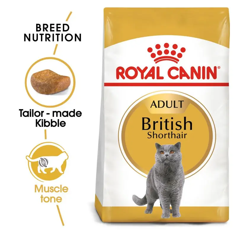 میزان پروتئین در غذای خشک گربه بالغ بریتیش برند رویال کنین متناسب با بدن عضله ای گربه های بریتیش در نظر گرفته شده و درصد بالایی از غذا را تشکیل می دهد. همچنین حاوی ال-کارنیتین است که تاثیر بسزایی در متابولیسم چربی ها دارد. اسید چرب امگا 3 (EPA و HDA) موجود در این غذا، علاوه بر تاثیر در زیبایی پوست و مو، به حفظ سلامت استخوان ها نیز کمک می کند. میزان متعادل مواد معدنی و فرومولاسیون آن نیز به حفظ سلامت دستگاه قلبی و عروقی و همچنین دستگاه ادراری کمک می کند. اندازه دانه های غذا متناسب با دهان این گربه است و کمی حالت خمیده دارد تا بهتر جویده شود.