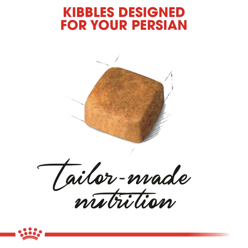 پرشین ها ظاهر با فرم سر پهن و کوتاهی دارند و غذای خود را زیر زبان خود می خورند، بنابراین رویال کنین پرشین کیتن با شکل مخصوص کیبل (دانه های غذا) را ساخته شده است و هر قطعه کوچک و مربعی شکل است و بافت نرمی دارد تا جویدن و دریافت مواد مغذی آسانتر شود.