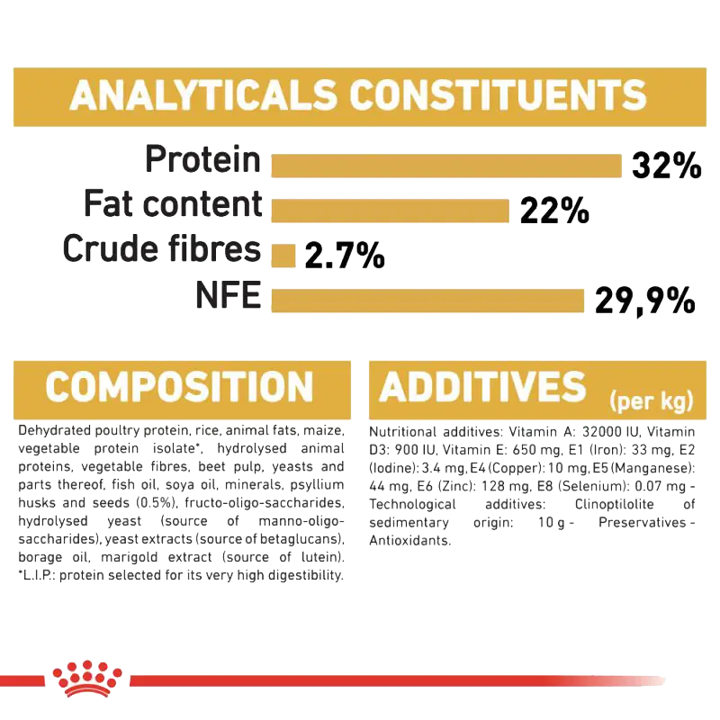 عناصر: پروتئین طیور (خشک شده)، برنج، چربی حیوانی، ذرت، پروتئین گیاهی ایزوله*، پروتئین حیوانی (هیدرولیز شده)، لیگنوسلولز، تفاله چغندر، مخمر و اجزای آن، روغن ماهی، روغن سویا، مواد معدنی، پسیلیوم (دانه و پوسته 0.5%) ، فروکتو-الیگو-ساکارید، هیدرولیزات مخمر (منبع مانان-الیگوساکارید)، عصاره مخمر (منبع بتا گلوکان)، روغن گل گاوزبان، کنجاله گل همیشه بهار (منبع لوتئین).