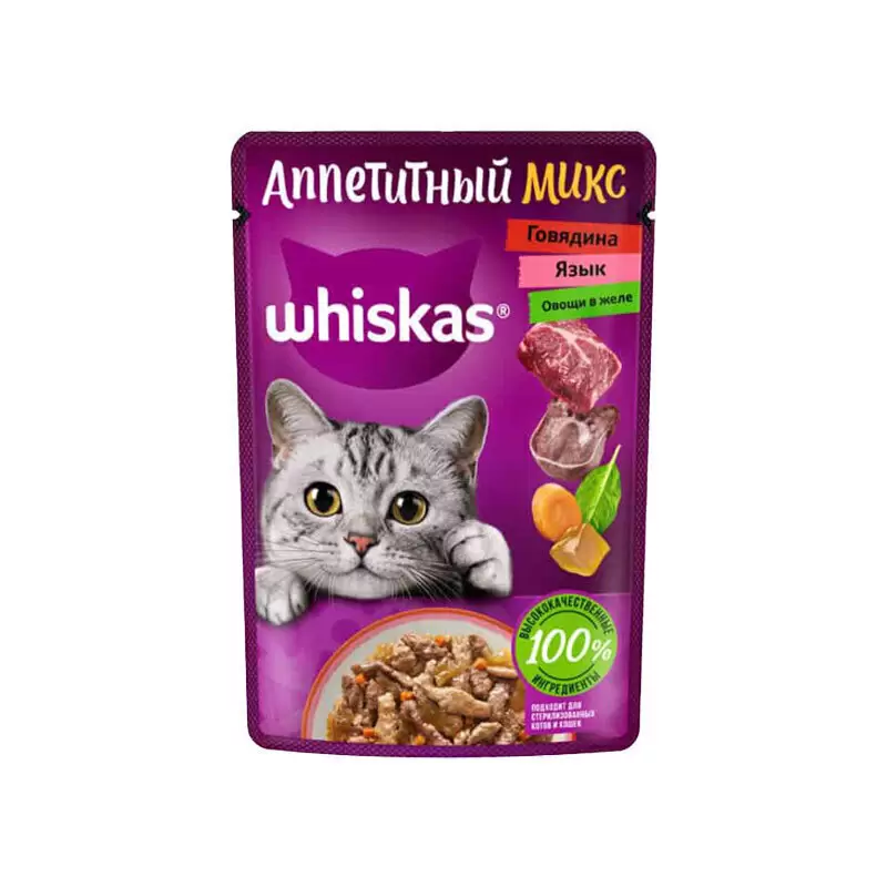 پوچ گربه ویسکاس با طعم گوشت گاو و زبان Whiskas Beef & Tongue وزن 75 گرم