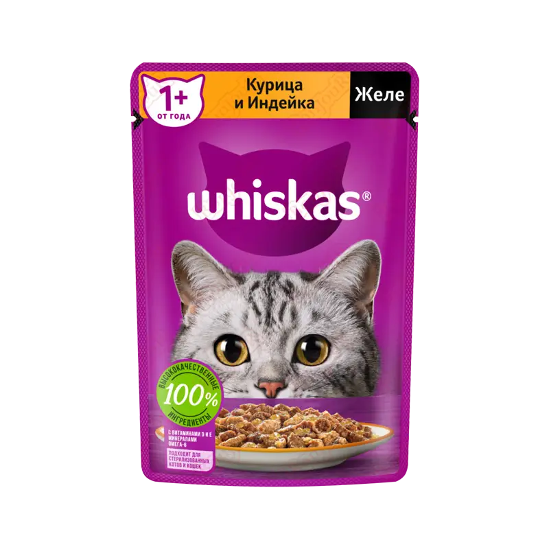 پوچ گربه ویسکاس با طعم مرغ و بوقلمون در ژله Whiskas Chicken & Turkey وزن 75 گرم